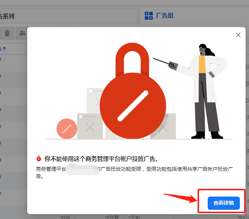 4.BM受限或个人广告账户受限,都会影响我们自己操作账户,所以需申请复审,点看“查看详情”,跟着FB的提示往下走进行申诉即可。(提醒:最近两天审核严格,误审的也比较多,有被永久受限的可能。不紧急的情况可以错开这两天,过两天再申诉);