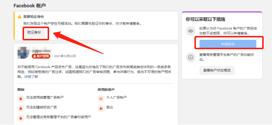 此界面,点击左侧栏“Facebook商务管理平台账户”,则显示受限的BM,界面右侧的“申请复审”一般会无法点击,需要先验证身份。